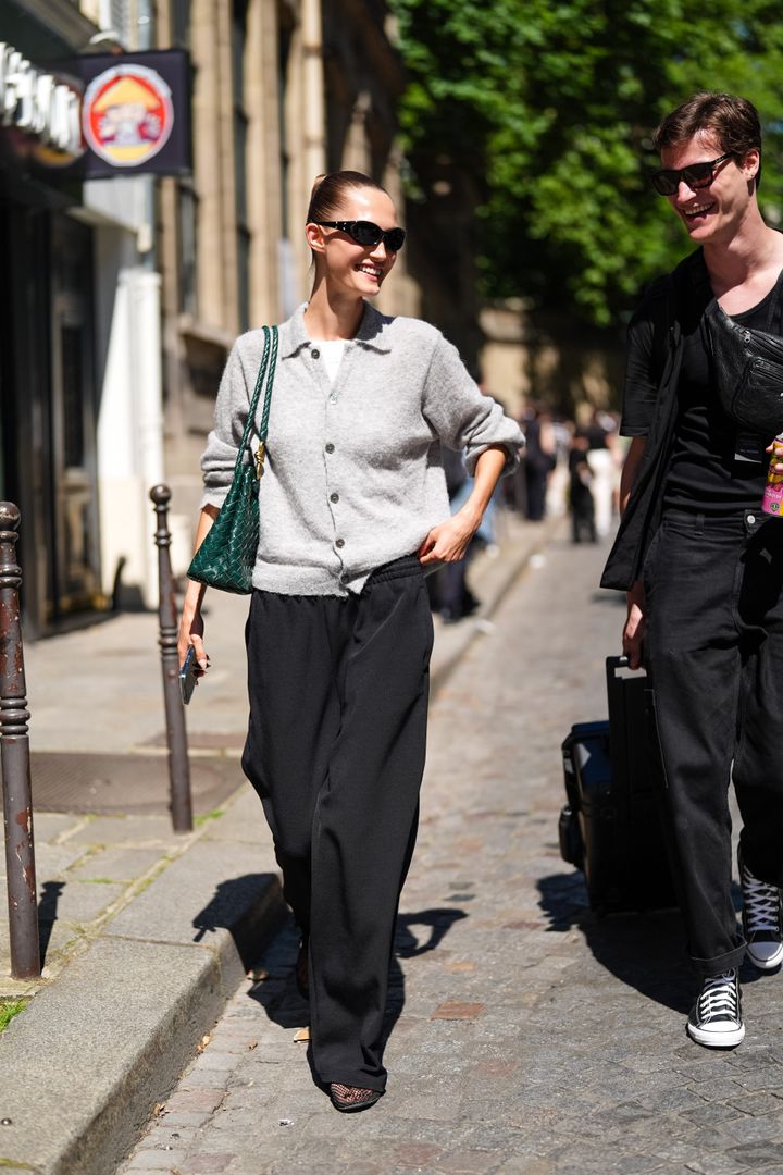 地味見えしがちなグレーパンツは、肌見せでバランスをとると、ぐっと上級ムードな着こなしに。淡いトーンでまとめると、すっきりと洗練された印象に仕上がります。