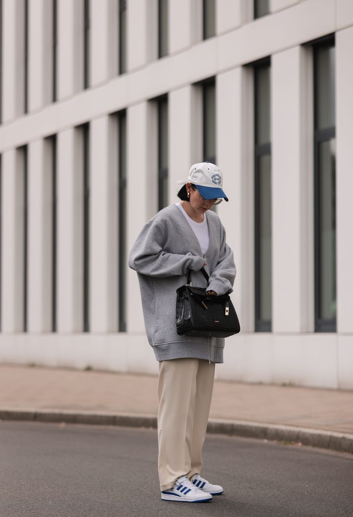 デイリーに何かと活躍してくれるライトグレーのカーディガン。柔らかなベージュパンツとのコーディネートは、今っぽいエフォートレスなシルエットや、キャップ&スニーカーの抜け感がポイントです。