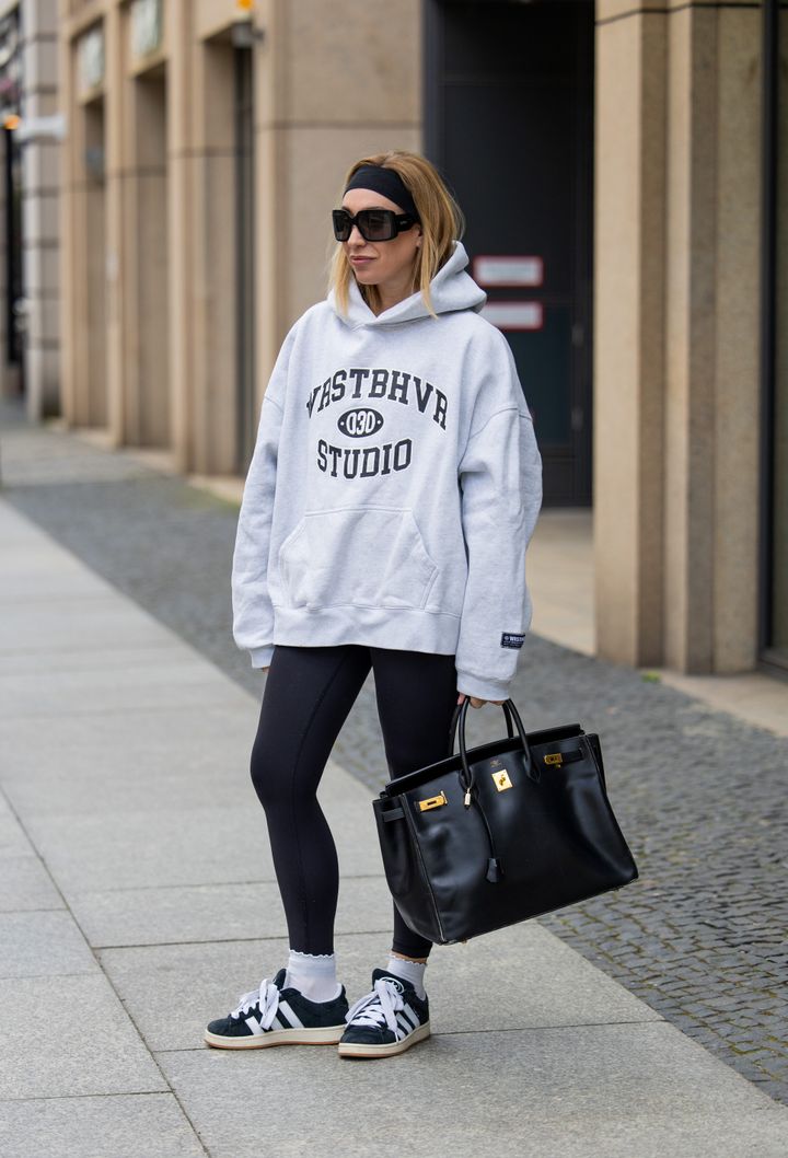 パーカーコーデに困ったら、モノトーンでまとめると、カジュアルに傾きすぎずモダンな印象に。エルメスの“バーキン”でスポーティなコーディネートを一気に格上げ!