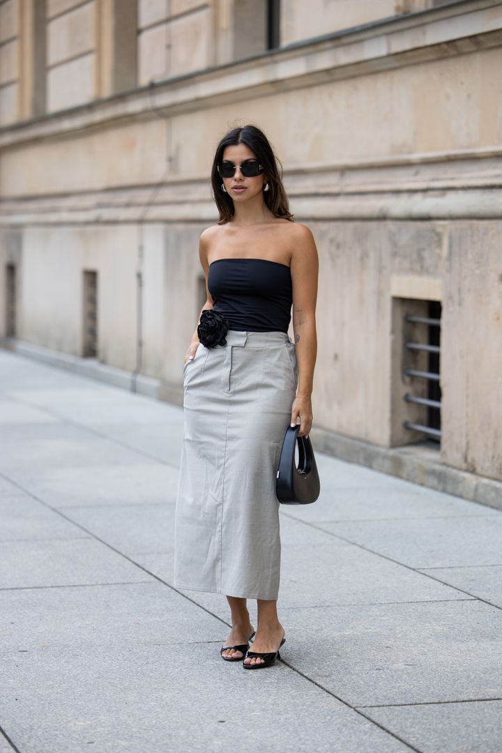 シンプルな淡いグレーのボトムスは汎用性が高いので、一枚あるとシーズンレスで便利。ブラックとのカラーブロックで、モダンな夏コーデをエンジョイ。