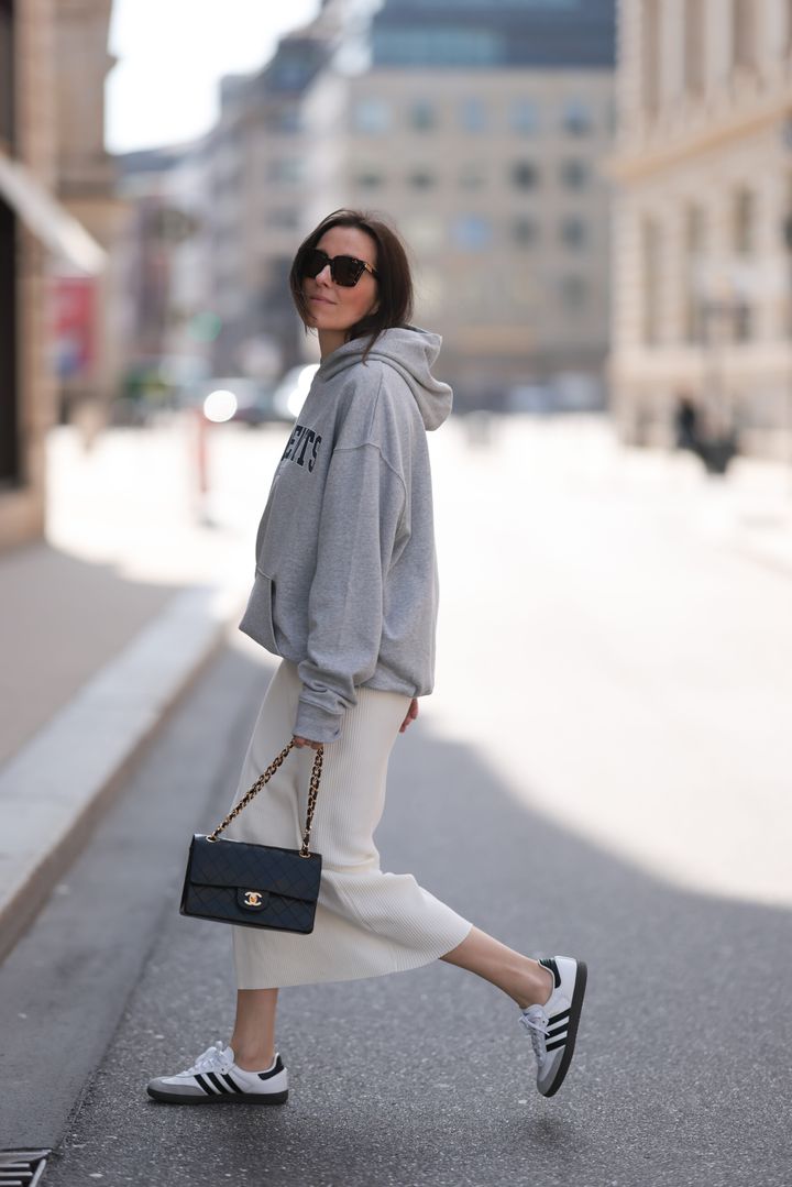 さらっと着こなしたいグレーのフーディ。大人が取り入れるなら、きれいめのスカートやチェーンバッグでエレガントにバランスをとるのが正解。