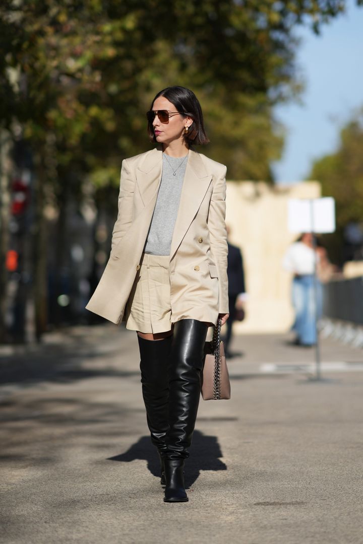 お仕事の定番、ベージュカラーのセットアップには、トーンが似たライトグレーのニットが好相性。地味になりすぎないよう、サイハイブーツなど、エッジの効いた小物を投入するのが吉。