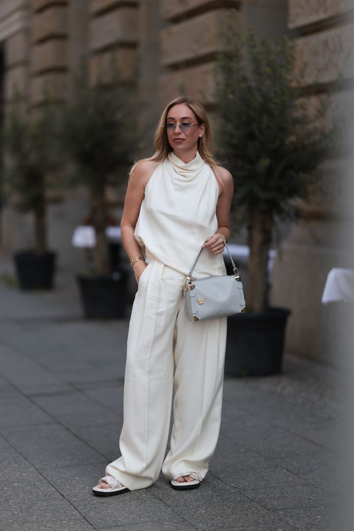エレガントに決めたオフホワイトのセットアップコーデ。小物は黒でも白でもなく、白コーデにやさしく溶け込むライトグレーを選んだのが洗練度アップの鍵。
