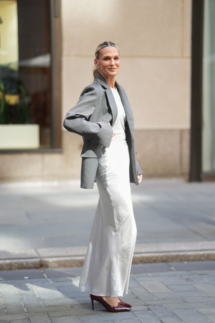 ワードローブの鉄板、グレージャケットを投入することで、白on白のコーディネートを秋モードにシフト。濃いグレーではなく、馴染みのよいライトグレーを選ぶとコントラストがつきすぎず、エレガントな雰囲気に。バーガンディ色のパンプスもシック。