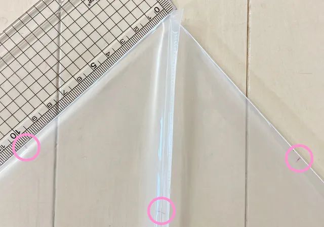 クリアファイルに3か所、同じ長さのところに、水性ペンで印をつけましょう。