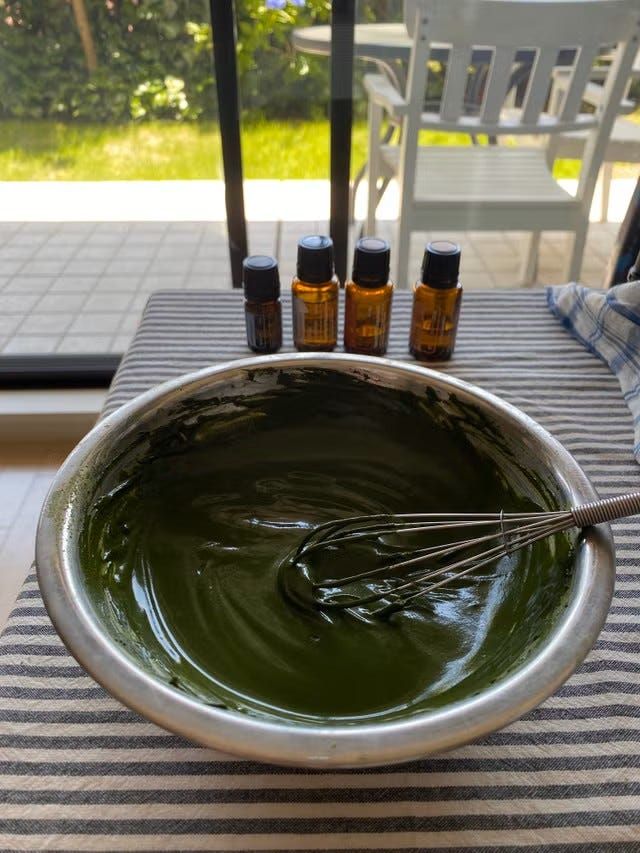 塗るコツ: 「ヘナの粉を溶く時に、エッセンシャルオイルを入れて好きな香りを調合しています。また、ヘナのみだと髪の毛が赤っぽくなるので、ヘナの後にインディゴ(藍)で2度塗りをして色を調整しています」