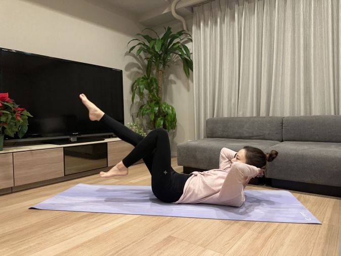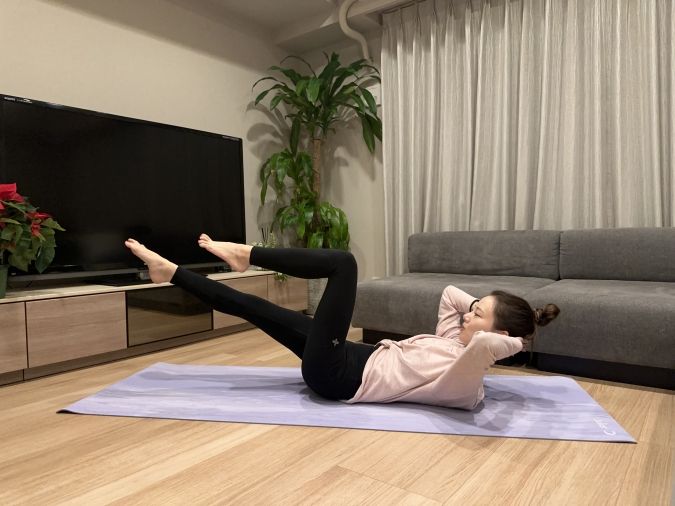 上体は写真くらいのイメージで、高く起こしすぎないように気を付けてください。脚は、お腹と腸腰筋を使いながら動かすよう意識してくださいね。