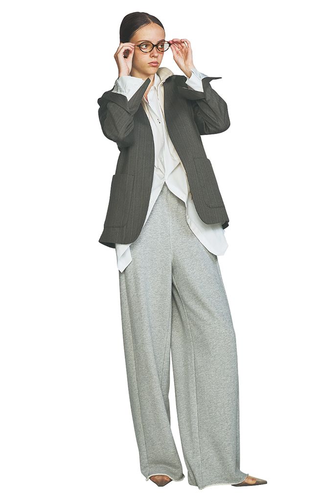 グレーのスウェットながら美形なストレートで、大人のリラックス感に。股上の深いハイウエストデザインで、ラクをしながら脚長に。シャツのすそからボタンを開けた逆Vのシルエットが、ワイドスウェットでもすっきり見える秘訣。