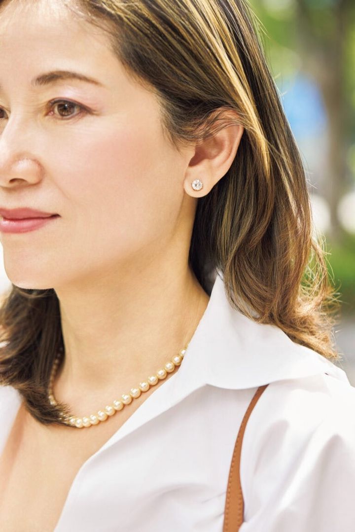 50歳を過ぎてから自分の雰囲気になじんできた気がして、出番が増えたというパールネックレス。シンプルながら着こなしを華やかに。