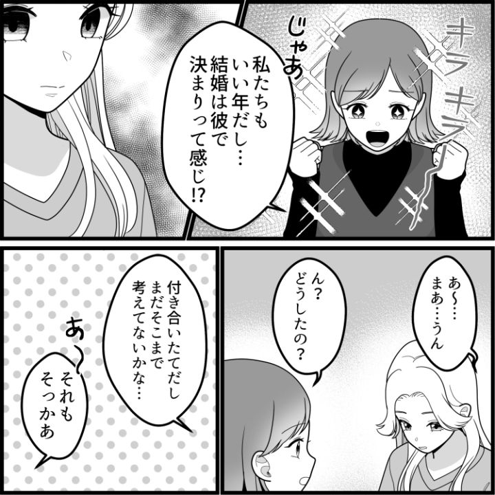 後日話を聞くと、どうやら無事に付き合えたようだ。カナコに、結婚のことも考えているのかと、つい勢いで聞いてしまうユミ。