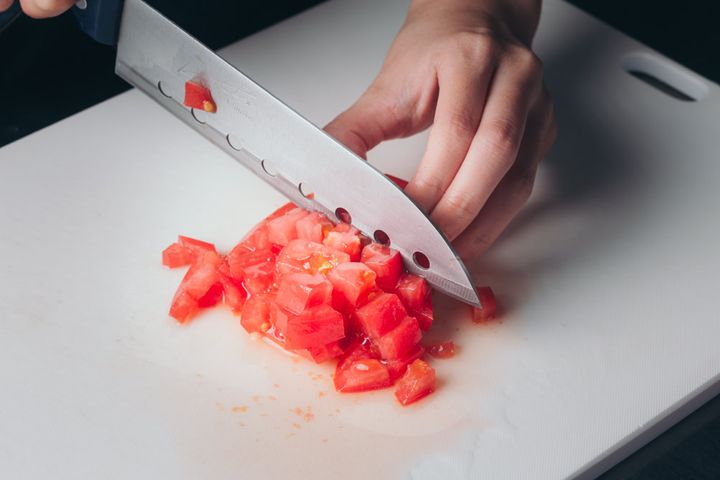 2. トマトはヘタをとって、5mm~1cm角に切る。