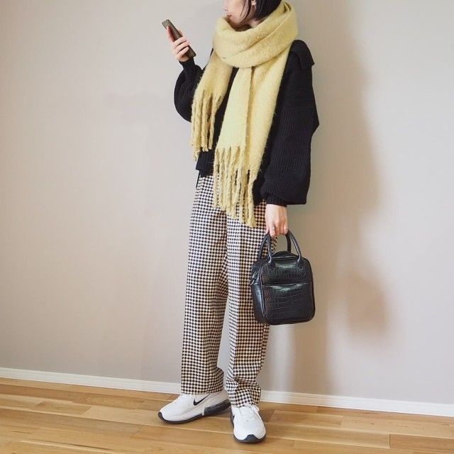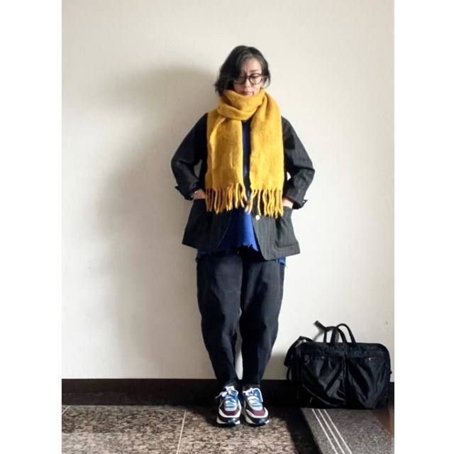 さらに明るいイエローカラーのマフラーはサッと巻くだけで顔まわりが華やぐ優れモノ。黒やグレーのモノトーンカラーの服にはもちろん、ベージュ・ブラウンなどナチュラルカラーにも似合い、コーデのアクセントにぴったり。ポジティブカラーの効果でイキイキとした印象に見えるのも魅力です。