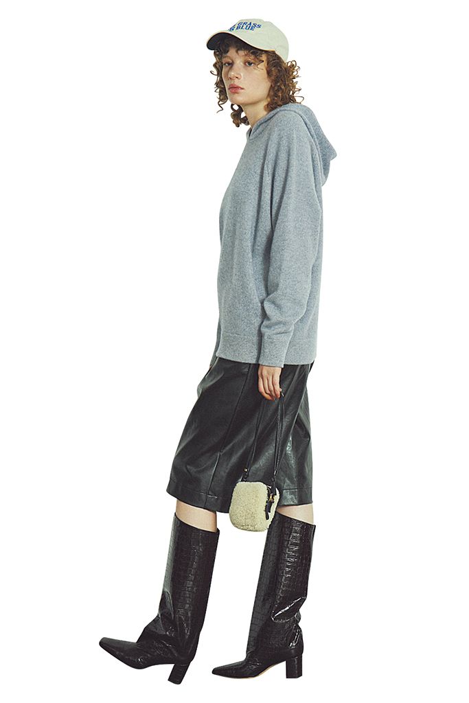 しっとりとしたニットをレザーのツヤで今っぽく。ゆるいサイズ感とすそまですとんと落ちる縦落ち感で、どんな形のボトムも受けとめられる。