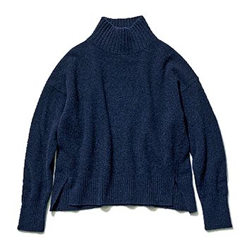 スウェットに近いようなスムースタッチで、保温性は保ちながら見た目のほっこり感をセーブ。しっとり・もっちりとしたキレイな質感だけど力みなく、素肌に着てもちくちくしない。さらには、メンズっぽいオーバーなサイズで選んでも、その縦落ち感が華奢見えにつながる、メリット満載のデザイン。