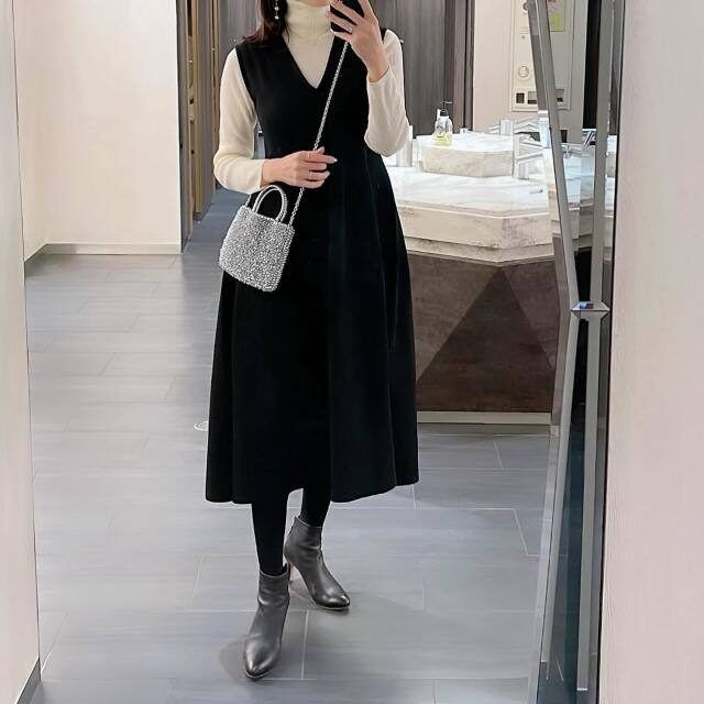 真冬でもハイクラスホテルは薄着で過ごしやすい室温に設定されていることがほとんど。そんなホテルランチには薄手の白ハイネックニット×黒ジャンパースカートのきれいめモノトーンコーデが着映えます。キラキラと輝くビジューのミニバッグを添えれば可愛いアクセントに。