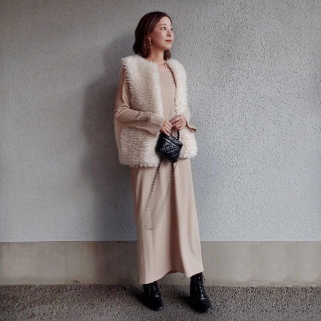 シンプルなワンピースを着てみたらなんだか寂しく見える……。そんなときに役立つのが白のファーベスト。ボリューム感のあるデザインと色合いが顔周りを華やかに見せ、クラス感のあるコーデに仕上げます。