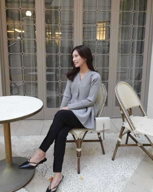 ホテルランチは華やかなカラーコーデよりも、シンプルな配色だけれどさりげなくフェミニン感の漂う服装の方が常連っぽいムードに。グレーのペプラムカーディガンにスリムパンツを合わせたら、ポインテッドトゥパンプスで足元をキリリと仕上げましょう。