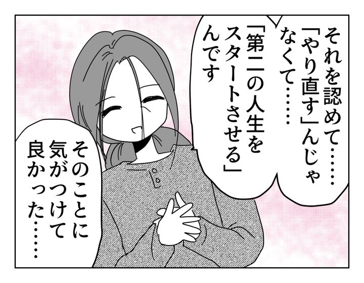 マイさん、お疲れ様でした。言いたいことをすべて言い切って、義実家の人たちと別れることができましたね。最初は「仕方ない」と、自分のすべての時間を子どもに費やしてきたマイさん。離婚してひとりになり、不安に押しつぶされそうになりながらも「自分の結婚生活は自分の人生に必要なものだった」と認めることができたのですね。自分の人生を否定しながら生きていくのは辛いでしょう。今、自分が笑っていられるために必要な時間だったんだと思いながら生きる……。そしてそんな風に笑っていられる「今」を大切に生きようとしている姿が素敵です。マイさんは大切なことに気がつけたのでした。