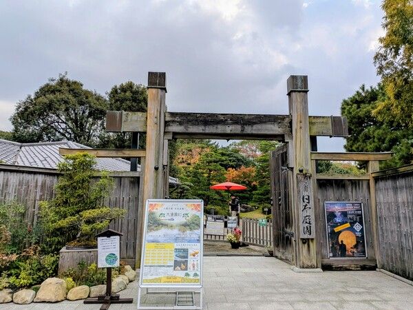 大濠公園の南側に位置する日本庭園。この門は冠木(かぶき)門です。特徴ある門ですね。
