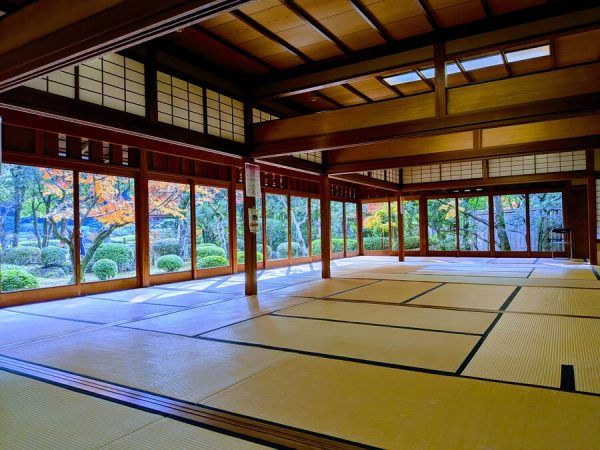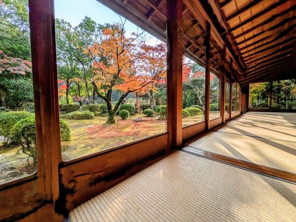 広々とした畳の間があり、大きな窓から見事な紅葉が見えます。