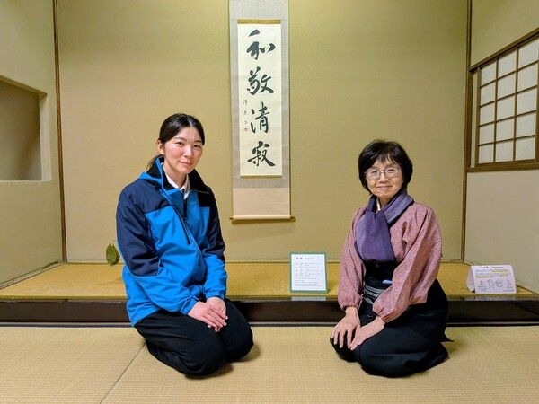 日本庭園の進藤さん(左)と梅田さん(右)。お二人とも気さくに茶会館やお土産品のことを教えてくださいました。お二人と後ろの掛け軸も素敵です!