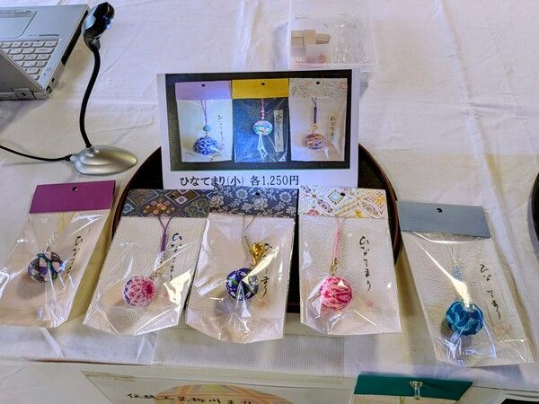 職員のお母さまが製作された伝統工芸 柳川まりのひなてまりは1250円です。柳川ではひな人形と共に「さげもん」を飾りお祝いします。「さげもん」の中央を飾る装飾が「柳川まり」です。縁起物として昔から親しまれてきました。とても華やかでプレゼントにぴったりです。ひなてまり(大)もあり、2500円で販売中です。