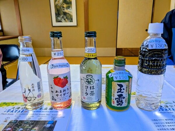 茶会館で販売しているドリンクです。左から太宰府梅サイダー(300円)、あまおうサイダー(250円)、抹茶コーラ(250円)、玉露(170円)、うきはの天然水(130円)。※文中価格はすべて税込みです。