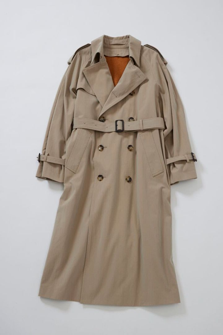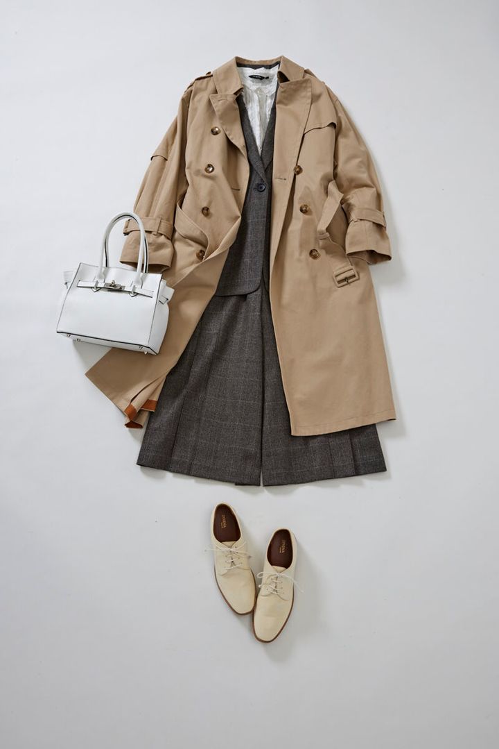 【着まわしコーデ1】トレンチ×セットアップ 正統派トレンチも今風のシルエットに。旬な印象のオンスタイル