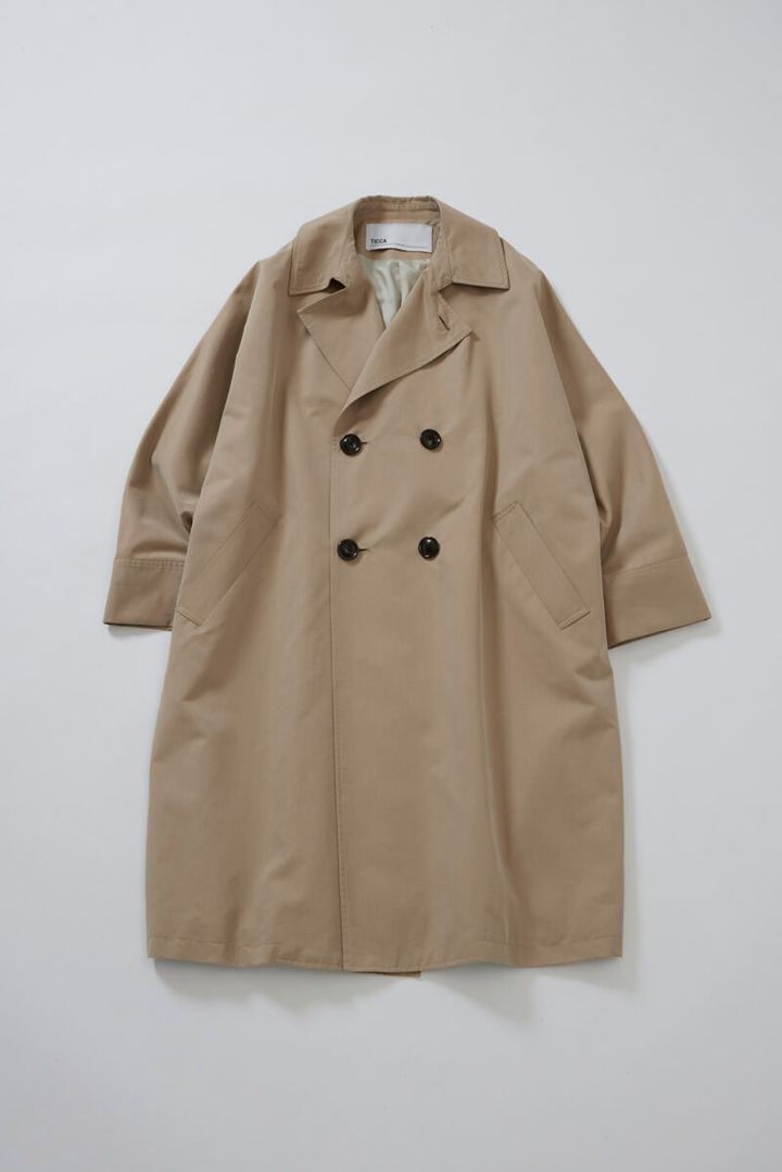 人気ブランド「ティッカ」定番のテントコートをトレンチ風にアレンジ。なめらかな肌触りと上品な光沢感があり、上質さがひと目でわかります。どんな体形の人にも合うよう計算されたシルエットで、袖丈も折って調節しやすいようカフス仕様に。撥水加工なので、少々の雨ならOKです。