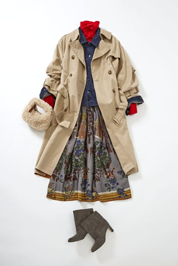 オフモードのコーディネートにはトレンド感を思いっきり盛り込んで。デニムジャケット+トレンチコートの組み合わせは、今旬な着こなし方。襟元と袖口にトレンドカラーの赤を効かせて、ボトムにはポエジーなプリント柄スカートで遊び心をプラス。小物には、小ぶりなファーバッグとスエードのショートブーツを合わせて。大人の休日におすすめです。