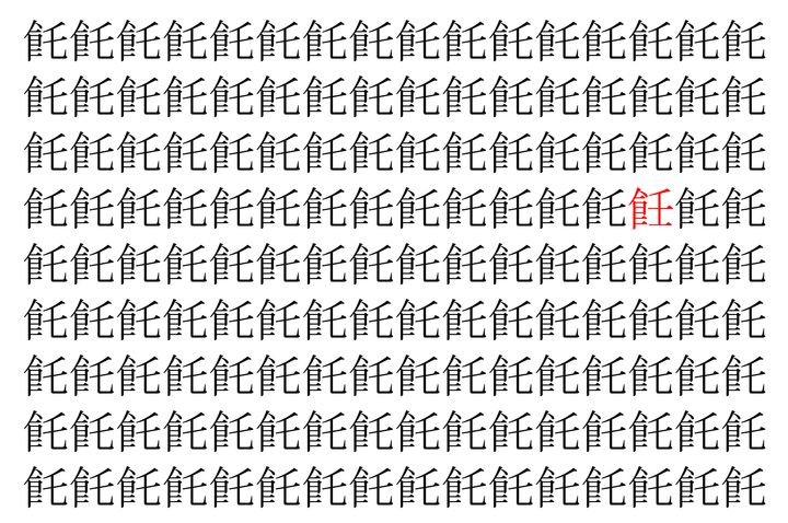 画像の中には、「飥」という漢字が縦に9行、横に16個並んでいます。 全部で144個となりますが・・・、そのうち1つは「異なる漢字」となってますよ!!