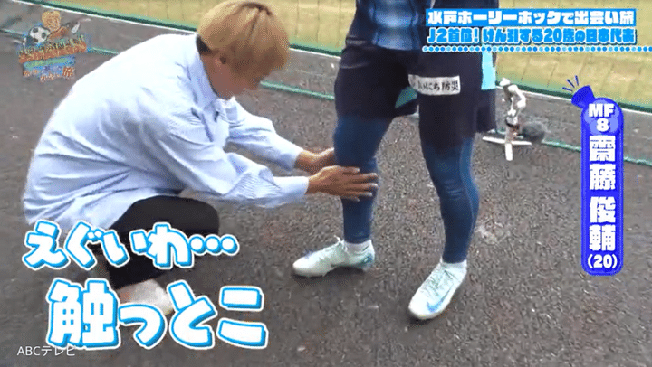 そして、「触っとこ!」と、齊藤選手のふくらはぎをべたべたとタッチ! さらに自慢の太ももまで触らせてもらう!