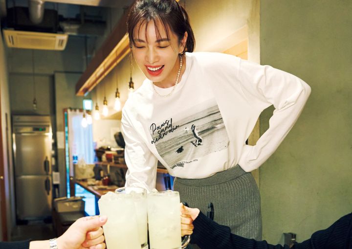 12月最初の土曜日は、社内の忘年会に。ワイワイ騒ぐ夜だからロンTでちょうどいいかも!白黒フォトプリ×大ぶりアクセで平日よりエッジ強めに仕上げたらまわりに褒められちゃうかも♡