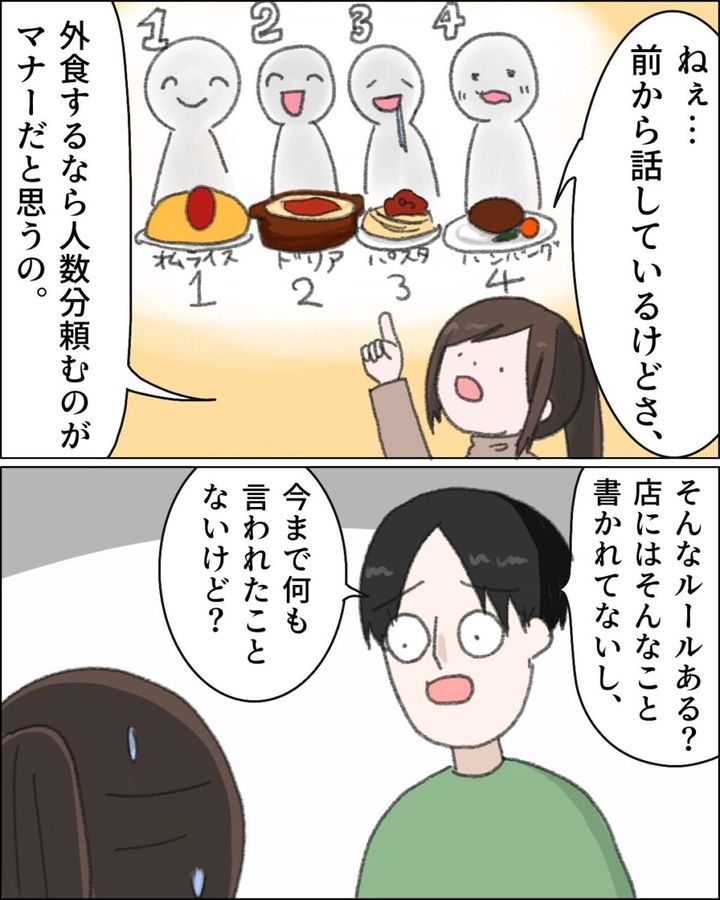 3. 常識外れな行動回避と外食は人数分の注文がマナーと伝えるもルールはないと夫が開き直る。注文しない義母|ママ広場マンガ