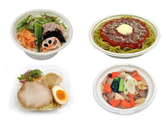 工場で製麺したもちもちバジル風味の太麺にトマトソース・チーズを盛りつけたスパゲティです。 カロリー:705kcal 【販売地域】東北