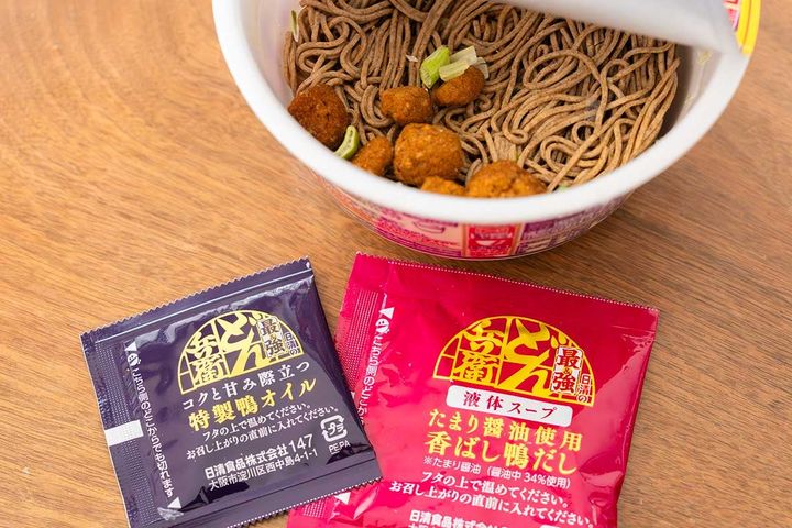 通常の「日清のどん兵衛 鴨だしそば」よりも、太いそばや大きいつくねを使用するなど、最強のどん兵衛となっています。過去にも販売されていたことがある商品なので、ご存知の方は多いのではないでしょうか。