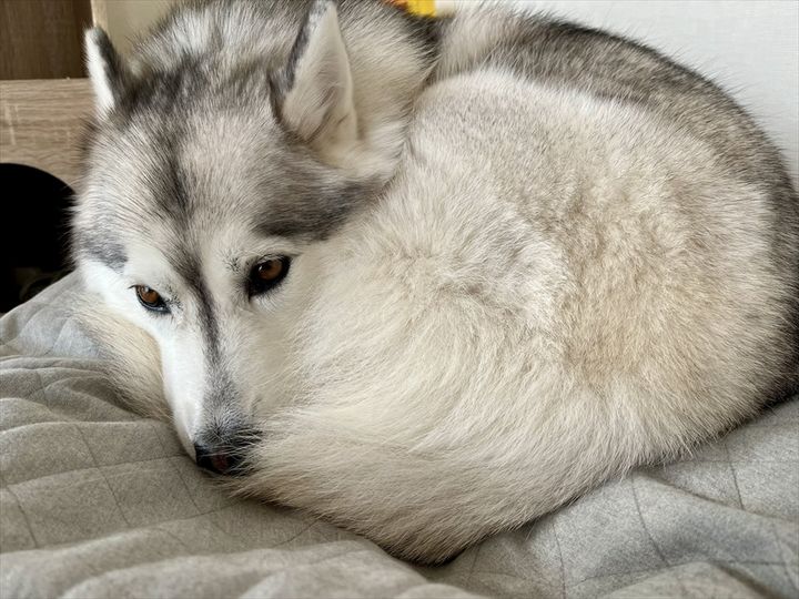 3. 室温21度でも寒い?!ハスキー犬が体を丸めて暖を取る姿が話題に「やはりハスキーはネコ・・」「ワンモナイトだぁ〜」