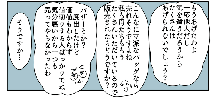 どうやらご近所さんにもお友だちにも、すでにあげていたようです。「気を遣うだろうからたくさんはあげられない」と言いますが、それなら私たちにも気を遣ってほしい……。販売することも提案してみましたが、バザーは作品の価値がわかっていない人ばかりで気分を悪くしたという理由で拒否しました。