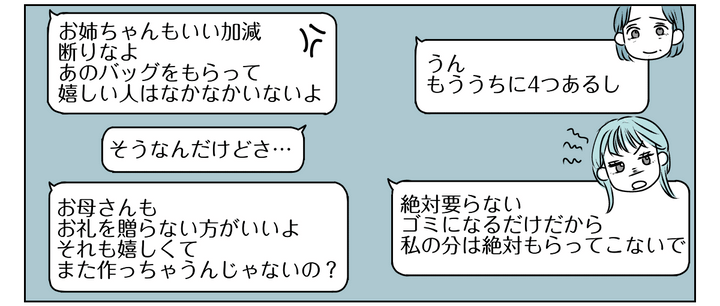 母も妹も、バッグは要らないどころか迷惑がっている様子。