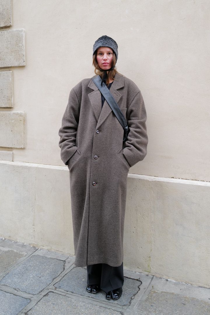 ゆるいシルエットのロングコートで、パリらしいエフォートレスさを意識したジャネットの冬コーデ。「メゾンマルジェラ」の“タビ”ブーツをセレクトすることで、着こなしにアクセントをプラスしたのがポイント。