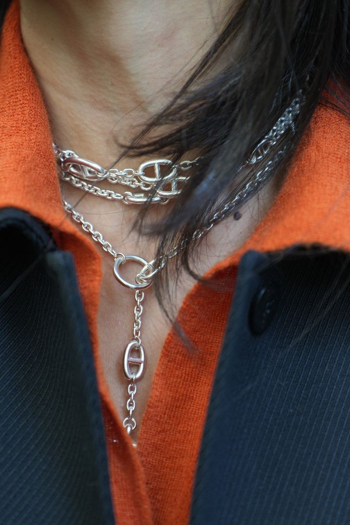 ジュエリーも「エルメス」を選ぶことが多め。“シェーヌダンクル”のネックレスが冬コーデに華やぎを届けて。