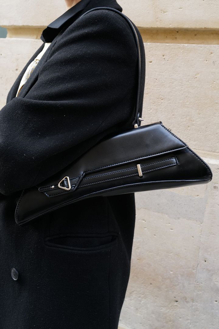 ヴィンテージのバッグは、横長シルエットが今っぽいデザイン。シャープなシルエットがクールな黒コーデにベストマッチ。