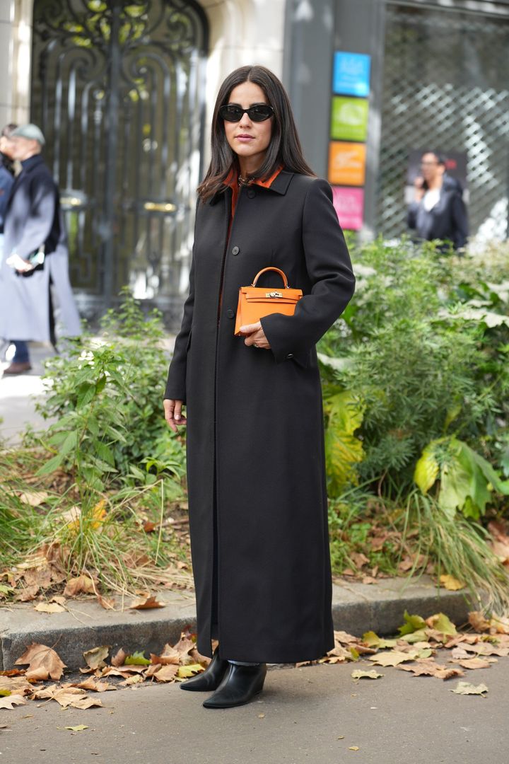 「マックスマーラ」のベーシックな黒コートがメフルナーズの定番アウター。この日は、同ブランドのシャツや「エルメス」の“ケリー”でオレンジカラーをプラス。重めのアウターには、あえてビビッドなカラーをミックスし、上級感のあるモードコーデに仕上げて。