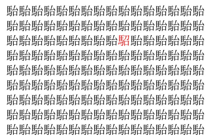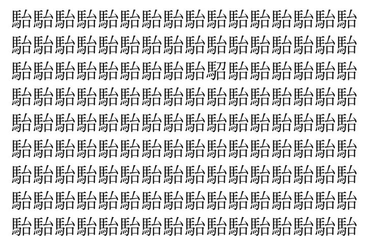 画像の中には、「駘」という漢字が縦に9行、横に16個並んでいます。 全部で144個となりますが・・・、そのうち1つは「異なる漢字」となってますよ!!
