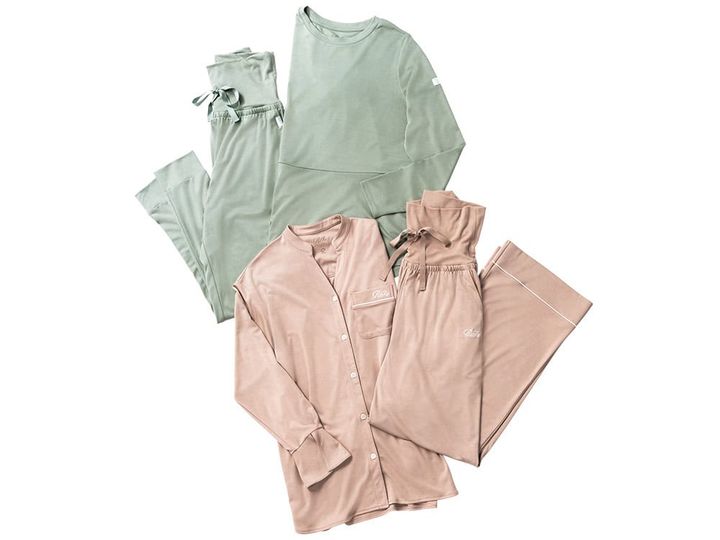 血行を促進する特殊繊維バイタルテック®を使用したリカバリーウェア。柔らかな肌触りで着心地が抜群にいい! 続けて着用すると起床時に感じていただるさがなくなりスッキリ起きられるように。(グリーン)モイストスムース ロングスリーブプルオーバー ¥12,100ジョガーパンツ ¥16,500 (ベージュ)モイストスムース スタンドカラースリープウェア ¥38,500/すべてReFa VITALWEAR(MTG)