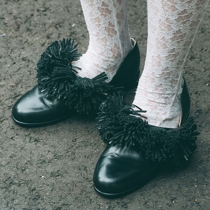 ボリューミーなフリンジが目を引く『ハルタ』と『クリンクルクリンクルクリンクル』のビッグコラボのシューズ。ホワイトレースのタイツで甘さをひとさじ。