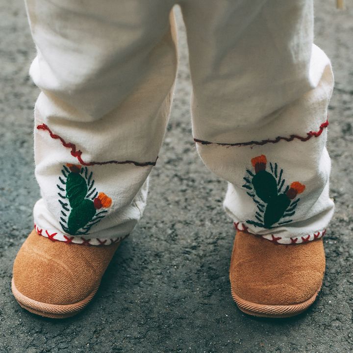 メキシカンモチーフの刺繍が可愛いボトムスに、ブラウンシューズをオン。こなれ感抜群な足元にアップデート♪
