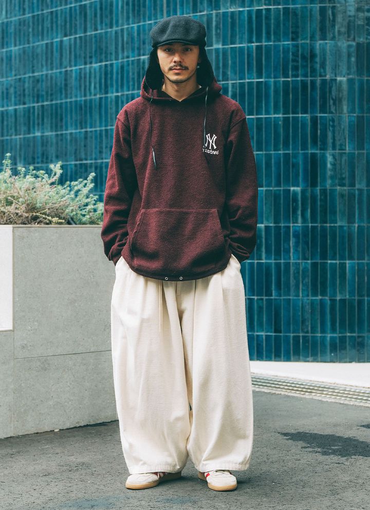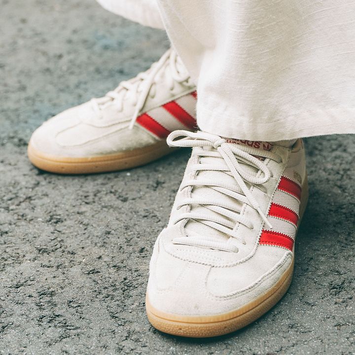 足元はすっきりとしたシルエットのスニーカーでバランス良く。レトロ感ある配色で、コーデのはずし役に抜擢!