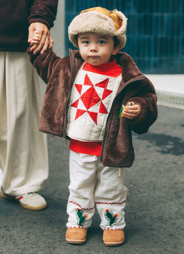 ママはヴィンテージアイテムで上品フェミニンに、パパはひとクセ小物でメリハリをつけた、カジュアルスタイルに昇華。キッズはハンドメイドのベストを筆頭にエスニックモードを満喫♪ レッドをキーカラーにして、それぞれの世界観を楽しむ親子コーデの完成!
