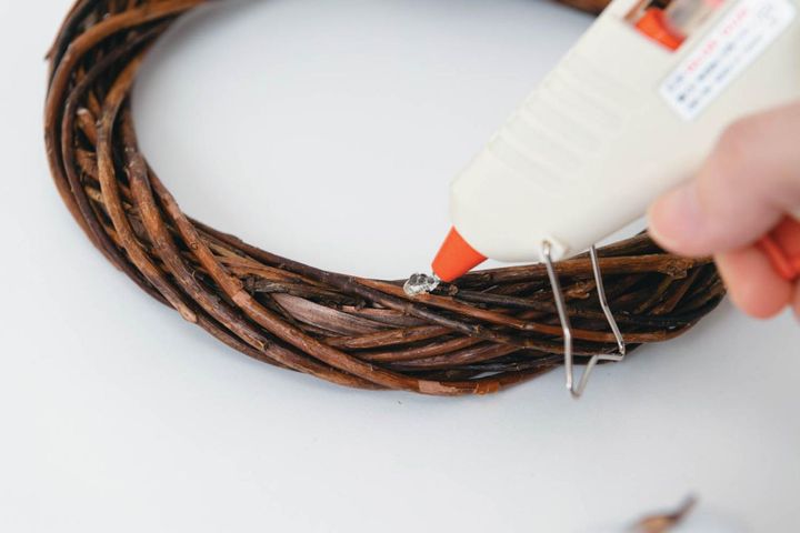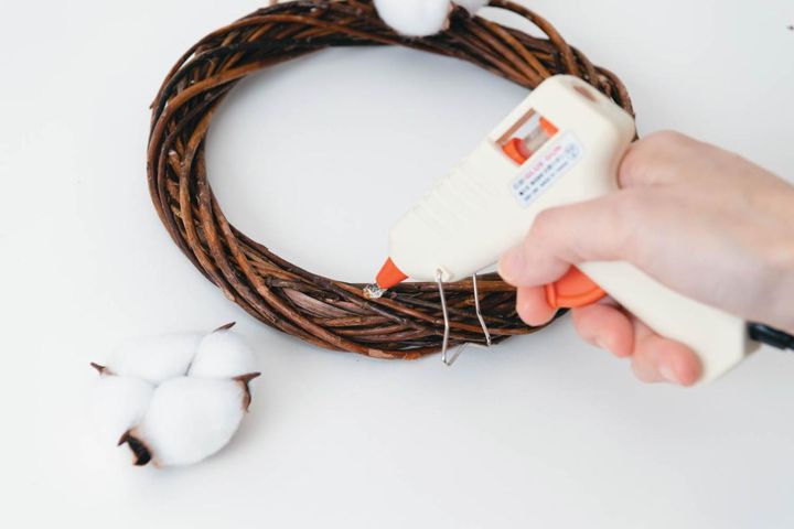リースを吊り下げる輪の位置を12時とし、主役のコットンフラワーを1時と7時の位置にグルーガン(材料外)で接着する。